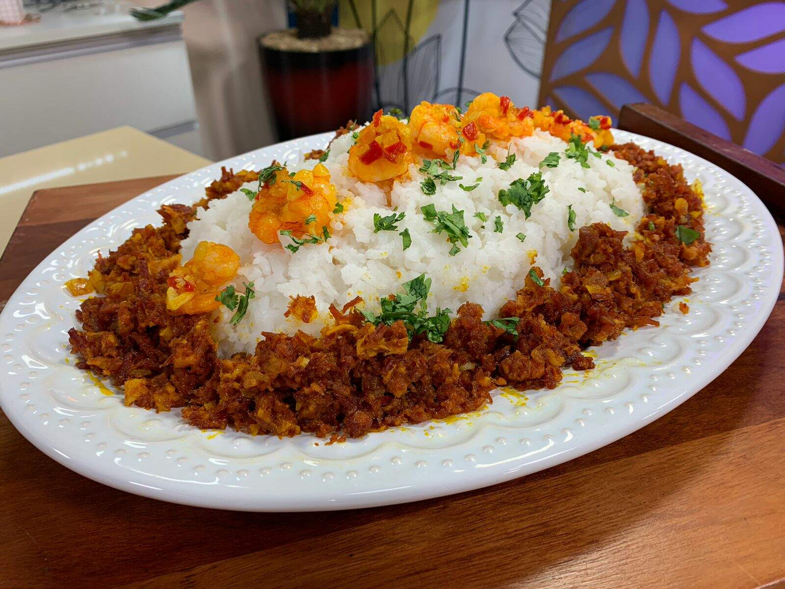 Cozinhe o arroz. Para isso, leve ao fogo uma panela com água e sal e adicione o arroz. No momento em que ferver, adicione o leite de coco, para garantir que o arroz fica em papa, uma característica dessa receita. Se não quiser usar o leite de coco, simplesmente fique mexendo o arroz até ficar bem mole. À parte, frite a carne seca desfiada ou cortada em pedaços no azeite de dendê, até dourar. Siga preparando agora o molho de acarajé: pique as cebolas e os alhos e refogue em uma outra frigideira com um pouco de dendê. Quando a cebola estiver dourada, acrescente o camarão descascado e a pimenta picadinha. Quando todos os ingredientes estiverem prontos, sirva o arroz de hauçá do seguinte jeito: coloque o arroz no centro de uma travessa, em redor a carne seca e no topo dele o camarão.