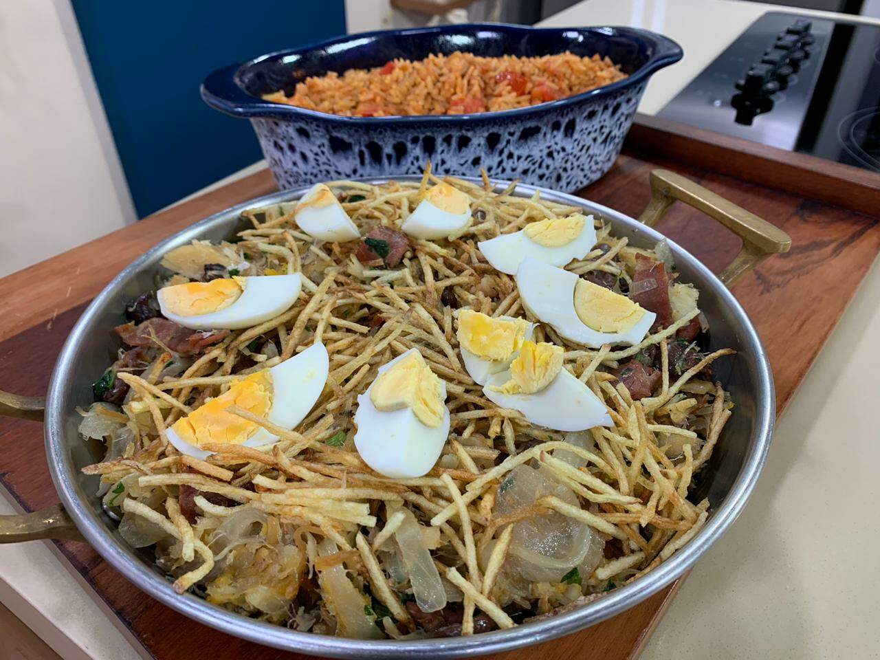 Dê uma fervura rápida no bacalhau. Tire a pele e as espinhas e desfie-o como para fazer pastéis. Corte o presunto em tirinhas. Descasque as batatas, corte-as em palha (palitos finos e pequenos), coloque-as num passador e lave-as. Enxugue-as e frite-as em óleo quente. Depois de fritas, escorra-as bem e coloque-as em papéis absorventes para tirar o excesso de gordura. Tempere-as com sal. Entretanto, descasque e pique as cebolas e leve-as para dourar no azeite. Junte o bacalhau desfiado e deixe refogar por cerca de 10 minutos em fogo brando. Misture o presunto e refogue mais. Bata ligeiramente as gemas dos ovos (2 ovos) e junte ao preparado de bacalhau. Mexa com um garfo até os ovos ficarem cozidos. Tempere com sal e pimenta. Por último, ponha as batatas fritas e mexa ligeiramente. Sirva quente, enfeitado com salsa picada e azeitonas pretas. Finalize com ovo cozido fatiado por cima.