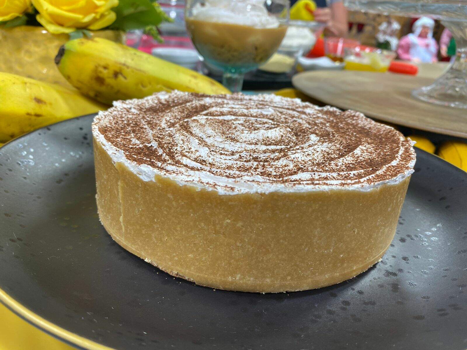 Retire a base da torta da geladeira. Coloque 1 xícara e ½ de sorvete de doce de leite. Coloque 4 bananas picadas e cubra com chantilly e finalize com cacau ou canela em pó.