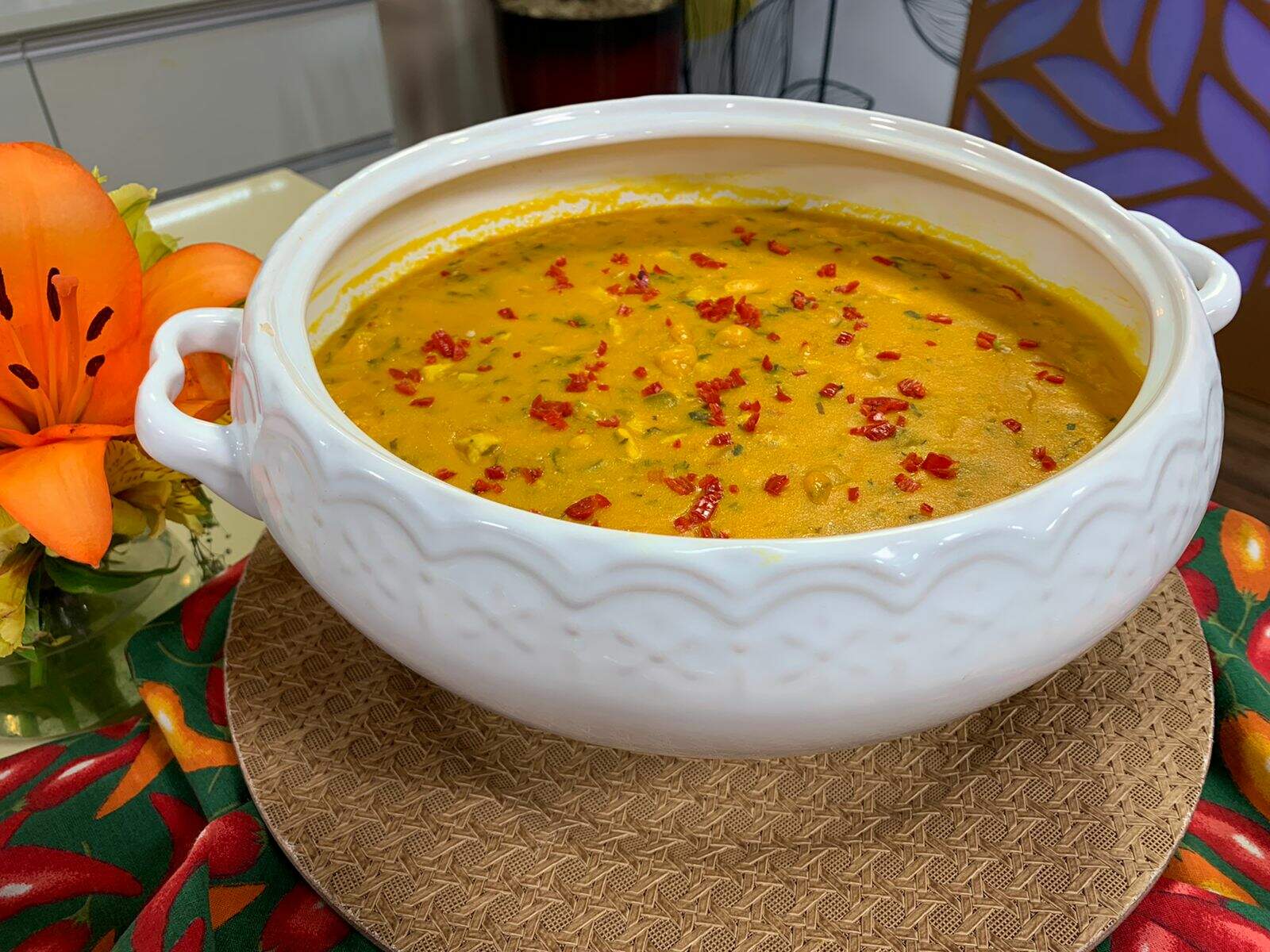 Cozinhar a abóbora até o estado de maciez. Bata a abóbora no liquidificador usando a mesma água do cozimento. Reserve. Corte o peito de frango em cubos, temperar com suco de limão e sal. Refogue no dendê, cebola, alho, pimentão e o tomate por 5 minutos. Adicione os cubos de frango e deixe em fogo baixo até o estado de maciez. Adicionar leite de coco; em seguida coloque purê de abóbora. Adicionar o restante do dendê continue mexendo até misturar todos os ingredientes. Deixar por 3 min. Para o toque final coloque pimenta a gosto e finalize com coentro ou salsa. Sirva quente.