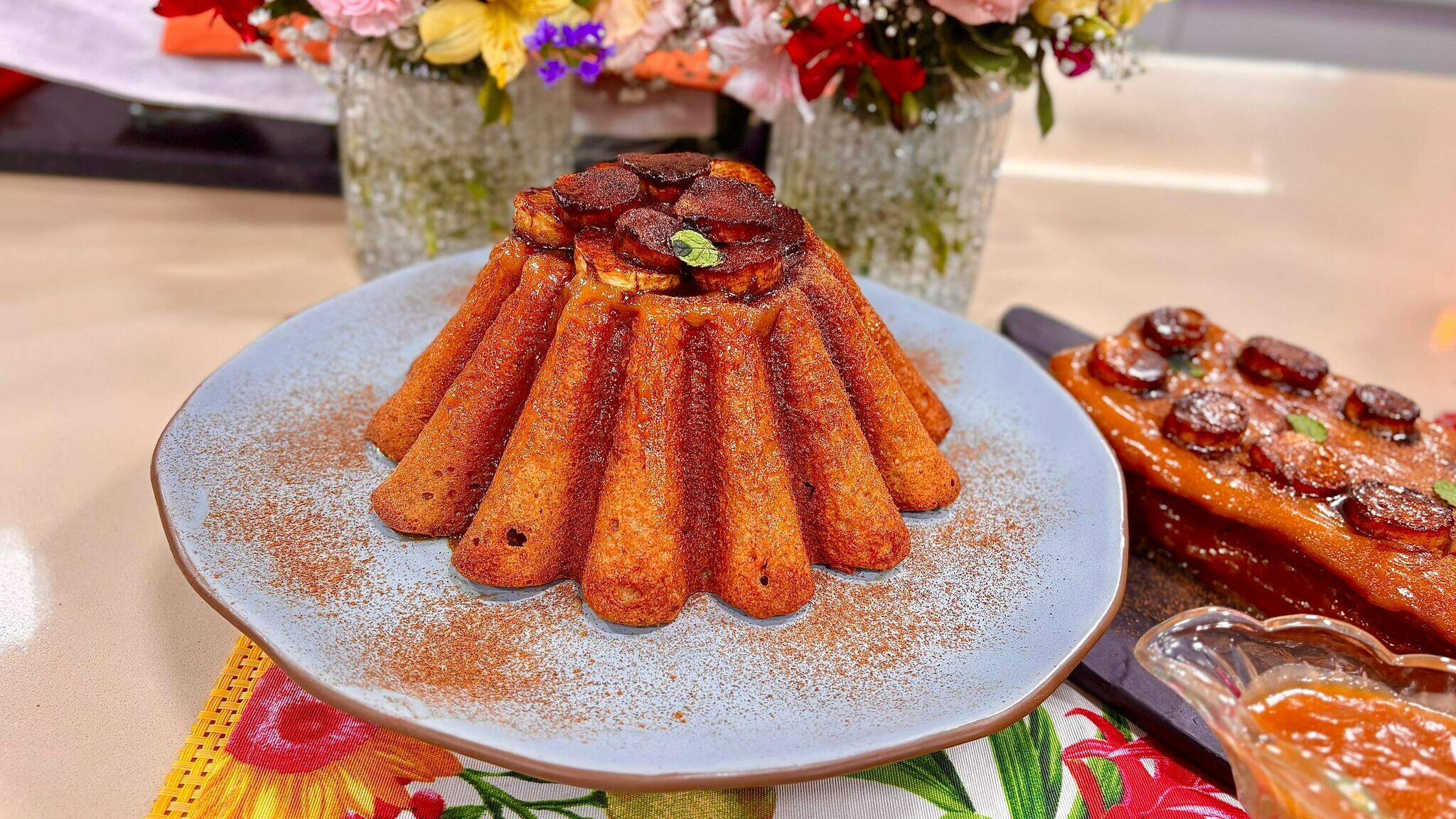 4. Depois do bolo pronto, acrescente o caramelo e decore com bananas flambadas.