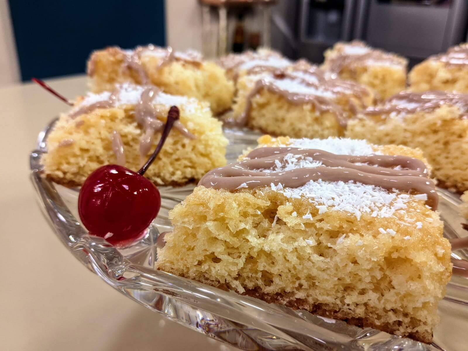 Em uma batedeira, bata as claras em ponto de neve bem firme. Reserve. Na mesma batedeira, bata as gemas, o açúcar, o suco de laranja e bata bem. Acrescente a farinha de trigo, o sal e bata mais um pouco, acrescente as claras em neve e o fermento e misture rapidamente com delicadeza. Em uma assadeira untada com manteiga e farinha de trigo, leve para assar em forno pré-aquecido a 180°C até que fique levemente douradinho. Retire do forno, faça pequenos furos com um palito de dente, regue com a calda de laranja com o bolo ainda quente. Corte o bolo em pequenos quadrados e salpique coco ralado e sirva.