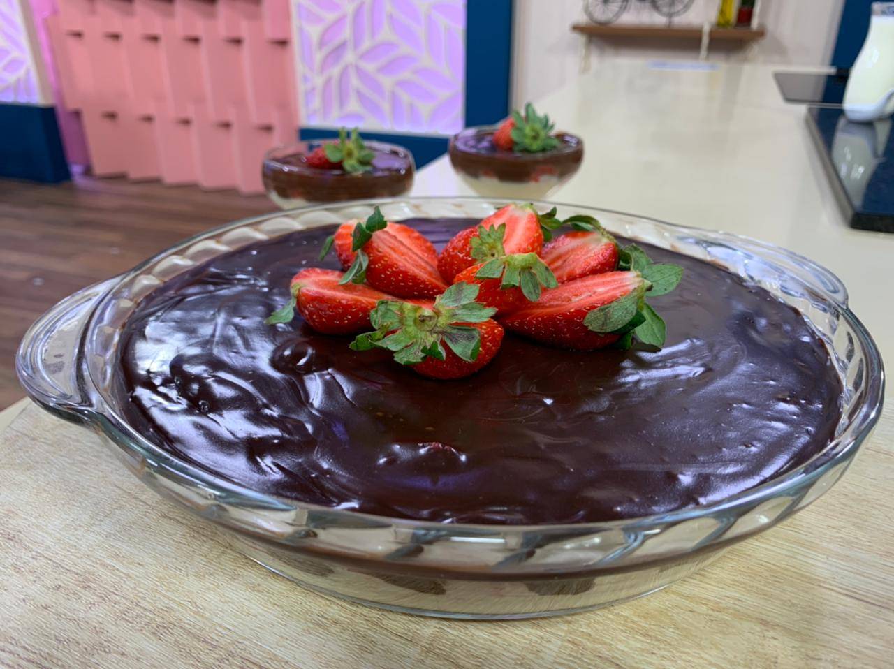 Em uma travessa coloque uma camada do primeiro creme, uma camada da fruta da sua preferência e por último a camada com o chocolate derretido e por cima coloque a fruta desejada. leve para gelar e sirva.
