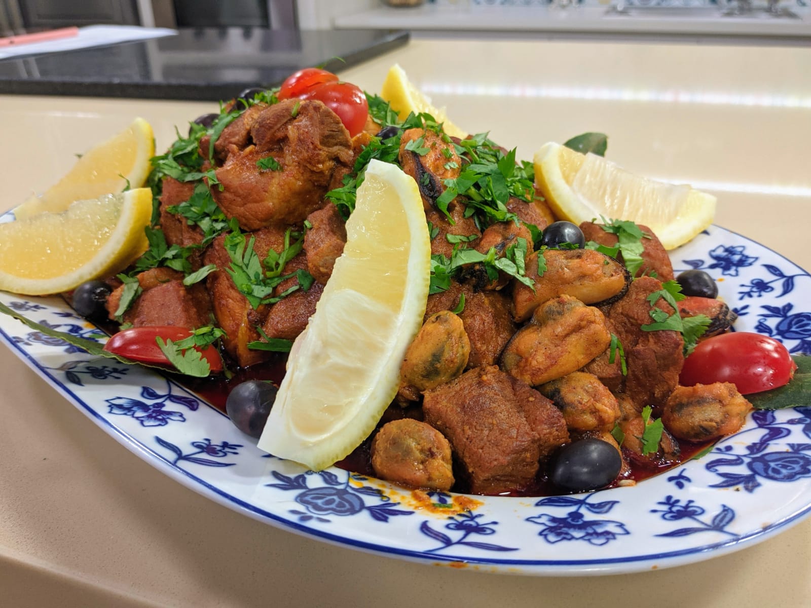 Temperar a carne com massa de pimentão, alho picado, folha de louro, sal, pimenta do reino e vinho branco. Deixe marinar por 4 horas. Coloque a banha em uma panela e quando estiver bem quente, acrescente a carne bem escorrida e deixe fritar, mexendo de vez em quando, até ficar bem dourada, junte depois o líquido da marinada e deixe ferver cerca de 2 minutos. Coloque depois os mexilhões. Vá mexendo por 4 minutos até estar macio, acrescente o coentro. Sirva com limão cortado.
