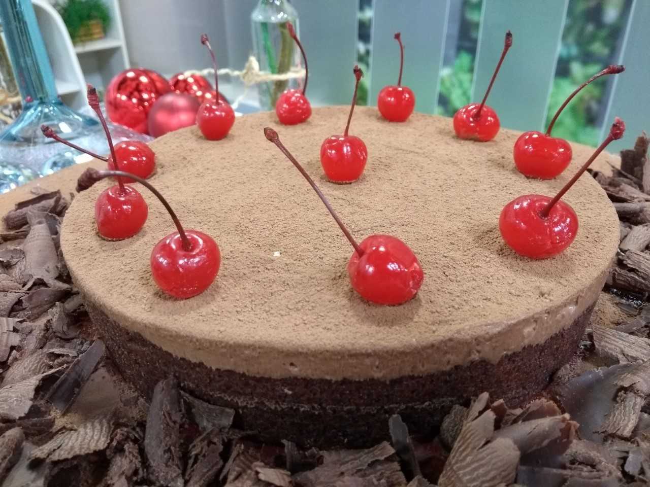 1. bater tudo na batedeira até ficar bem lisinho, colocar sobre a massa e levar a geladeira por 3 horas, polvilhar cacau em pó e decorar com cerejas de cabinho.