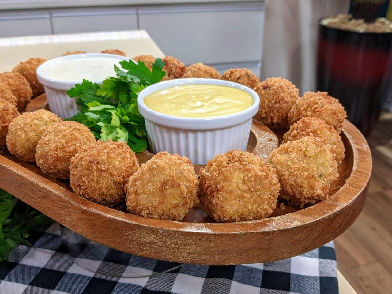 Em um processador, coloque o frango, o alho, a cebola e os temperos a gosto. Faça bolinhas e empane na farinha de trigo, no ovo e na farinha panko. Frite em óleo quente.