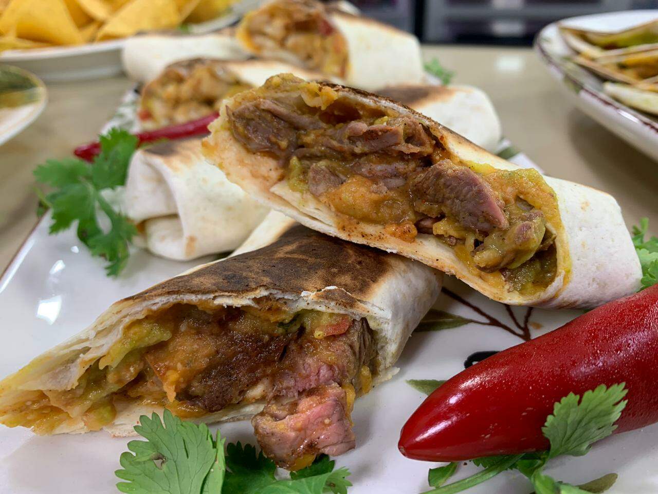 Em uma tortilla passar o chilli beans e o guacamole no centro da tortilla. Disponha a carne ou frango cortado em tiras e cubra com queijo ralado. Enrole a tortilha fechando as pontas. Leve o burrito enrolado em uma frigideira antiaderente e deixe tostar todos os lados do burrito.
