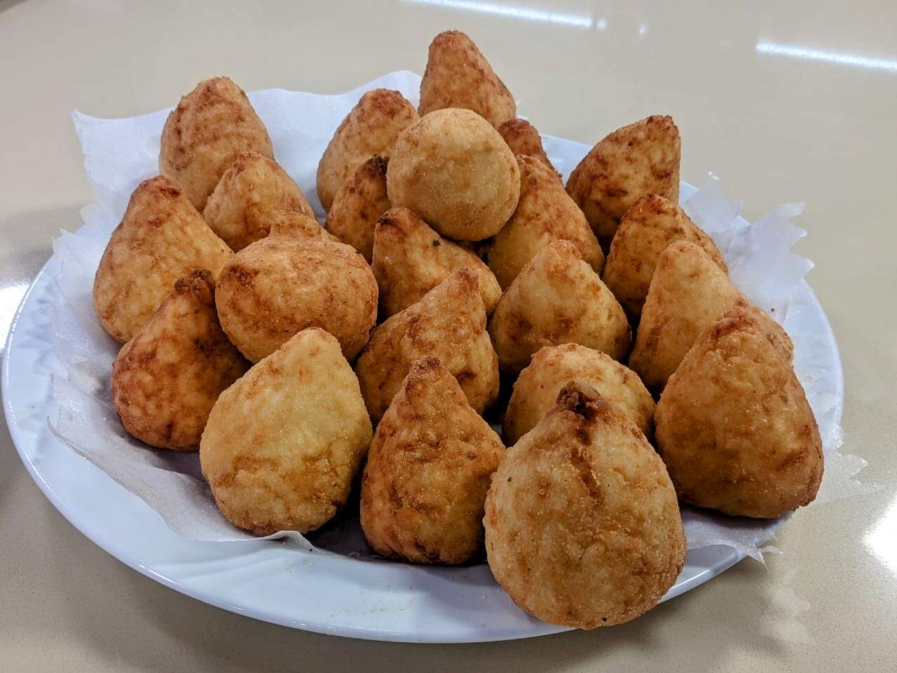 Empane as coxinhas de frango com massa de arroz com 2 ovos batidos (coloque uma pitada de sal) e na farinha de rosca. Faça esse procedimento 2 vezes para que fique bem empanado e crocante. Enquanto aquece o óleo para fritar, deixe na geladeira, isso faz com que o empanado não solte a casquinha da coxinha.