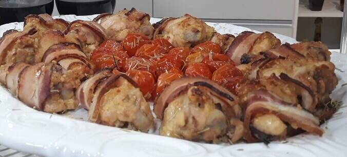 Modo de preparo: junte os ingredientes do creme (mostarda, maionese, castanha, alho e os temperos) e bata no mixer ou no liquidificador. Prove e acerte o sal se necessário. Num refratário coloque as coxinhas de frango e misture o creme envolvendo tudo. Pegue as fatias de bacon e enrole em algumas coxinhas. Agora é só tampar com papel alumínio e levar ao forno por 1 hora em temperatura de 180ºC, depois tire o papel alumínio e deixe dourar, virando as coxinhas para que tudo fique bem douradinho.
