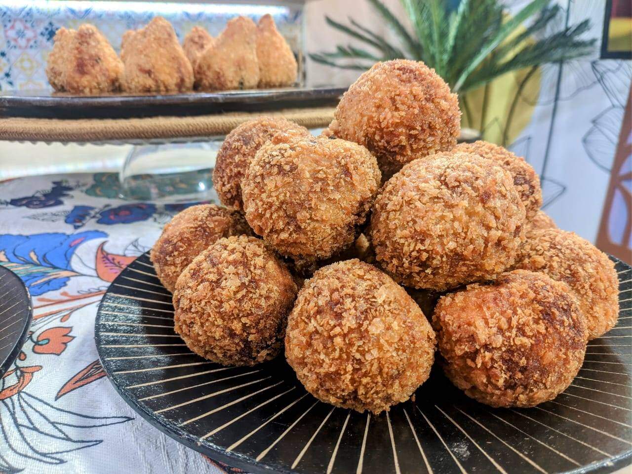 Modele as coxinhas colocando uma bolinha de requeijão em cada. Misture o caldo do pernil com 2 ovos batidos e farinha de trigo até formar liga. Passe as coxinhas nesta liga, e depois na farinha panko. Fritar em óleo pré-aquecido a 170°C.