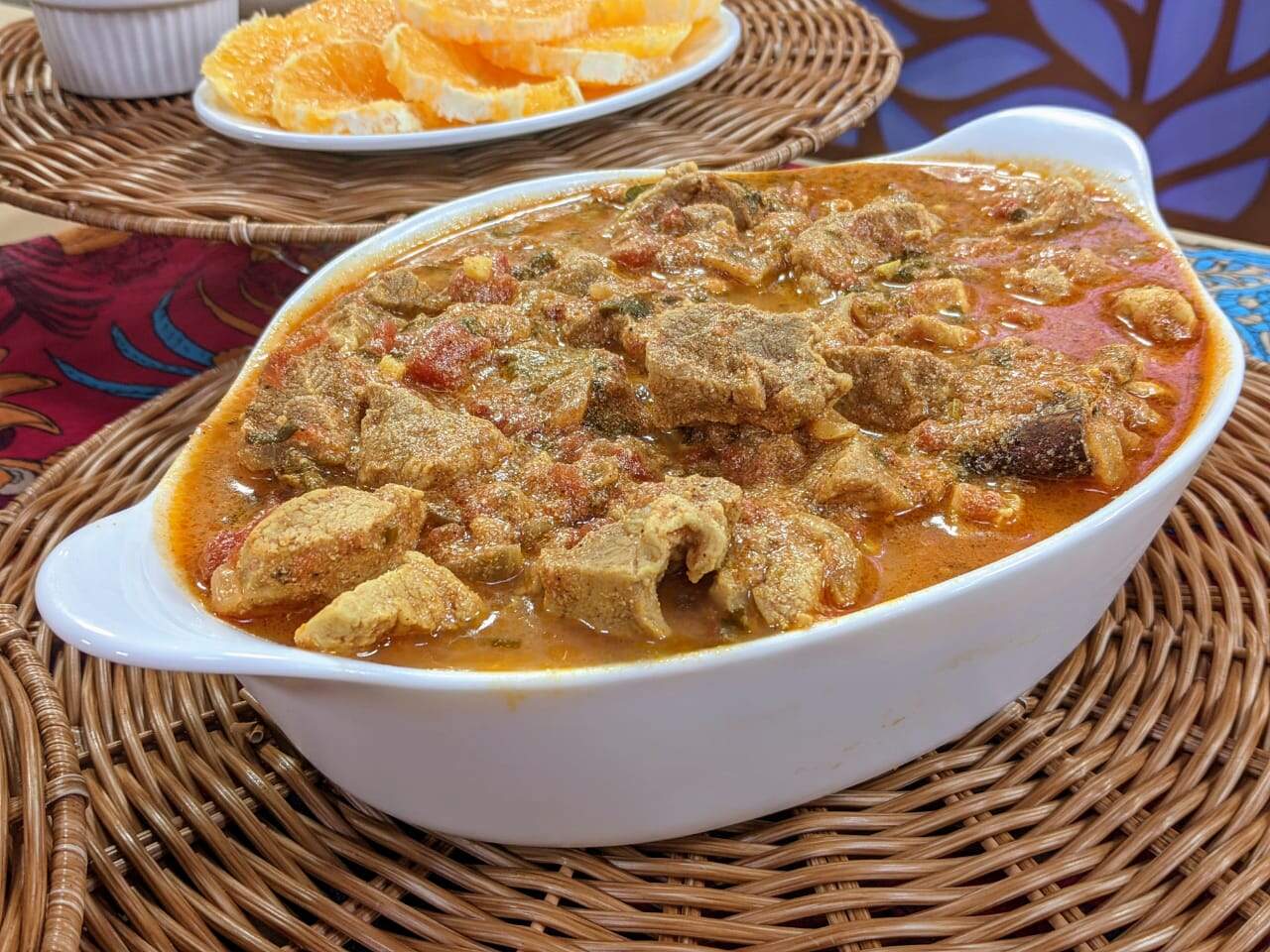 Descasque e pique fino a cebola e os dentes de alho. Lave, seque e pique fino a raiz e os talos do coentro – mantenha as folhas inteiras para servir. Leve uma wok (ou panela média) ao fogo médio. Quando aquecer, regue com o óleo, acrescente a cebola e tempere com 1 pitada de sal. Refogue por 2 minutos até murchar. Junte o alho, o gengibre, a raiz e talos do coentro picados e o louro e refogue por mais 2 minutos. Acrescente as especiarias e misture bem para perfumar. Adicione o tomate pelado em cubos (com o líquido), regue com a água e misture bem. Assim que ferver, abaixe o fogo e deixe cozinhar por mais 15 minutos para o molho encorpar e incorporar os sabores. Enquanto isso, prepare o lombo. Corte o lombo de porco em fatias de 2 cm de espessura; corte as fatias em tiras e as tiras em cubos de 2 cm. Deixe em temperatura ambiente enquanto cozinha o molho – a carne não pode estar gelada na hora de entrar na panela. Passados os 15 minutos do molho, adicione os cubos de lombo, tempere com 1 colher (chá) de sal e misture bem. Deixe o lombo cozinhar no molho por mais 15 minutos, em fogo baixo, mexendo de vez em quando, até que esteja cozido – não deixe o lombo cozinhar demais para não ressecar. Desligue o fogo e acrescente o iogurte, aos poucos, mexendo delicadamente. Sirva com as folhas do coentro, acompanhado de arroz basmati ou jasmine perfumado, chutney de manga, amendoim torrado, gominhos de laranja, rodelas de banana e cebola roxa fatiada fininho.