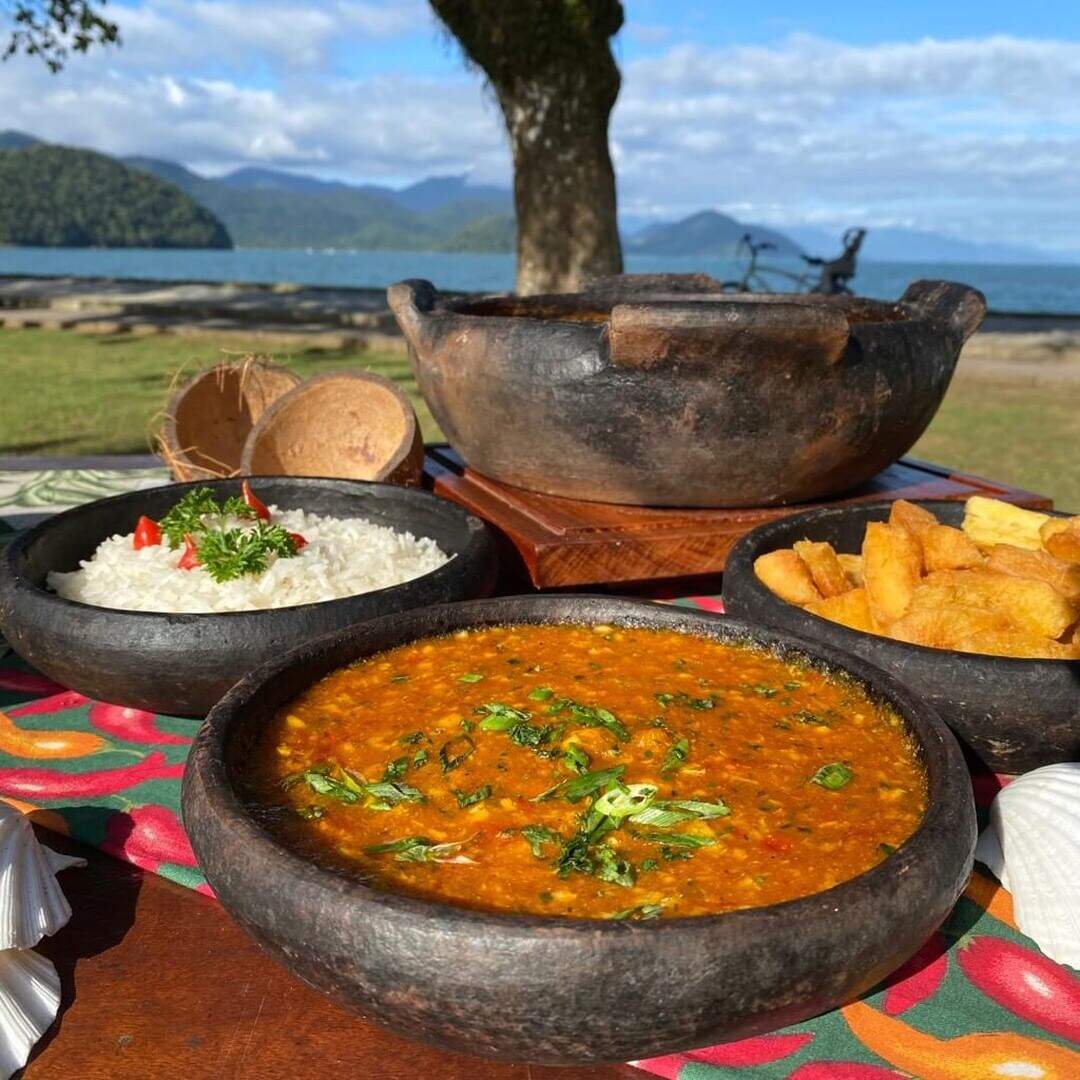 Em uma frigideira adicione manteiga e todos os frutos do mar. Tempere com sal, limão e pimenta. Refogue e adicione em seguida, leite de coco e azeite de dendê. Deixe cozinhar por 5 minutos. Adicione os pimentões, cebola e tomate e deixe cozinhar por mais 5 minutos.
