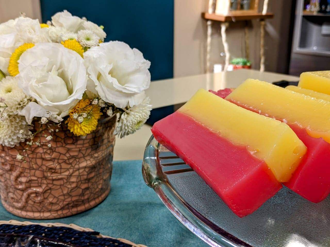 Unte uma forma com óleo e coloque a gelatina amarela. Leve à geladeira até firmar. Assim que a gelatina endurecer coloque a outra camada de gelatina vermelha e leve à geladeira por 3 horas.