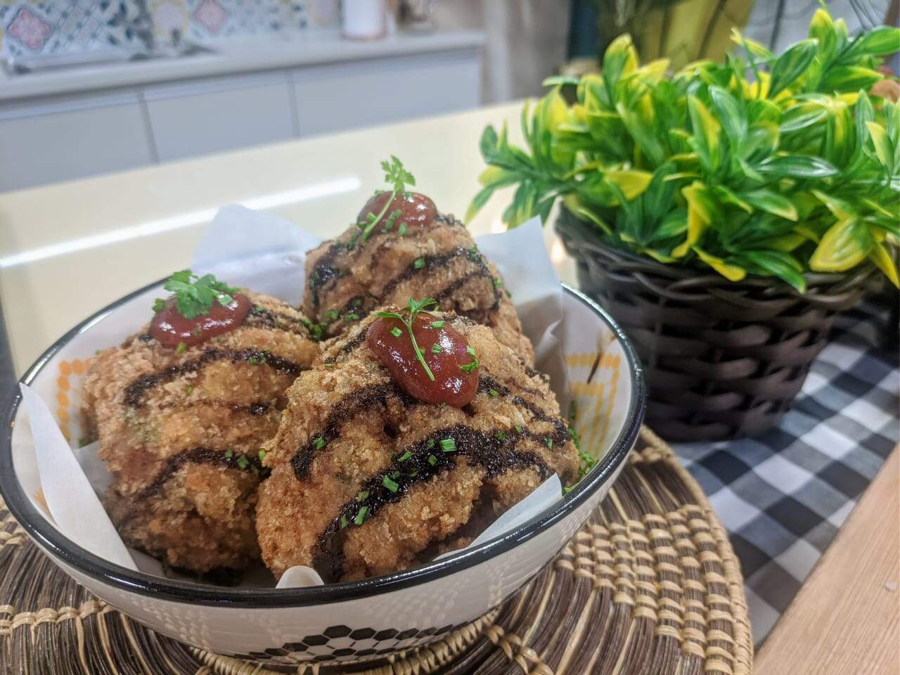 Passar os ovos cobertos com a carne na farinha de trigo, mergulhar no ovo batido com leite e passar pela farinha de rosca misturada com a farinha panko. Fritar em óleo pré-aquecido a 160°C por 4 minutos.