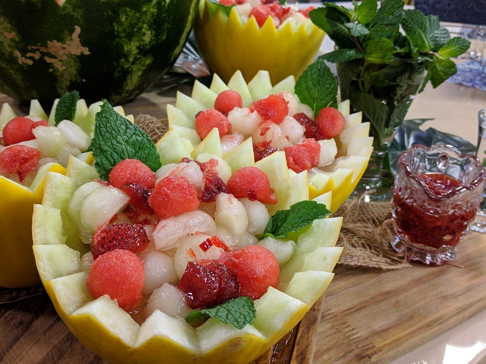 Coloque as bolinhas de melão e de melancia dentro da casca do melão que foi reservada, espalhe um pouco de geleia e decore com as folhas de hortelã.