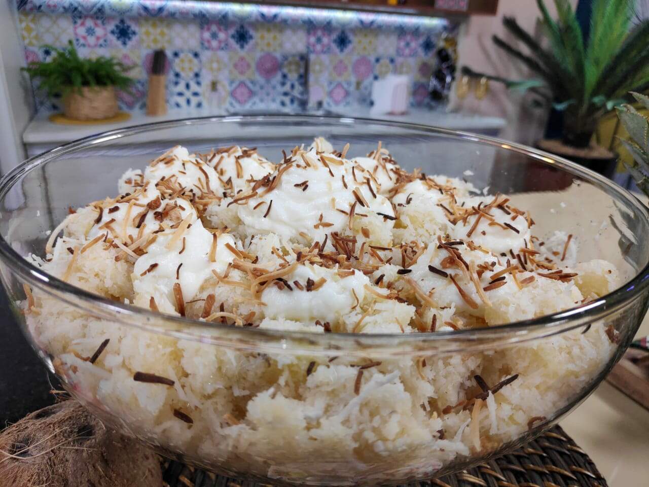 Em uma taça grande ou individual, coloque o creme, depois o abacaxi e salpique um pouco de coco ralado tradicional e um pouco do coco ralado queimado.