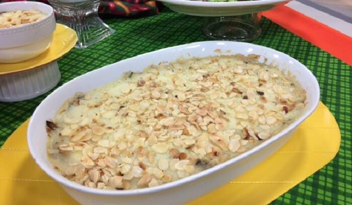 1. em uma travessa, forre com o purê de batata salsa, adicione o recheio, e por cima mais uma camada de purê, por último salpique as amêndoas, e leve ao forno na temperatura de 180 graus por 30 minutos.