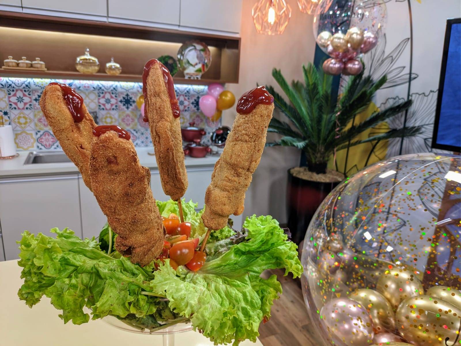 Pegue um palito de churrasco e coloque a salsicha intercalando com a banana em pedaços, passe esse espeto na massa reservada, em seguida na farinha de rosca, leve para fritar em óleo quente até dourar bem.