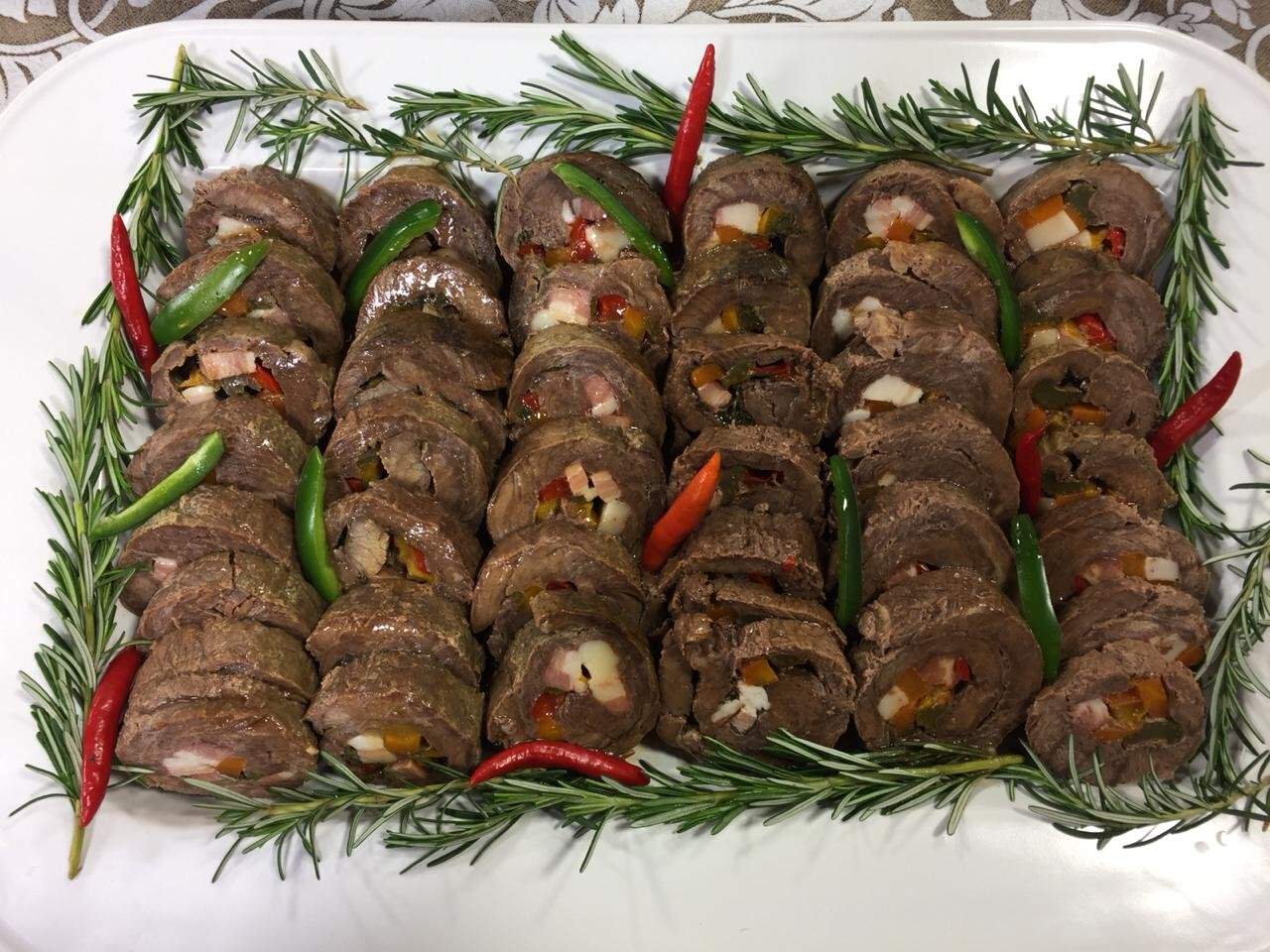 1. estenda o bife e distribua igualmente sobre cada bife: tiras de cenoura, vagem, bacon, 1 ou 2 galhos de salsinha e azeitonas.