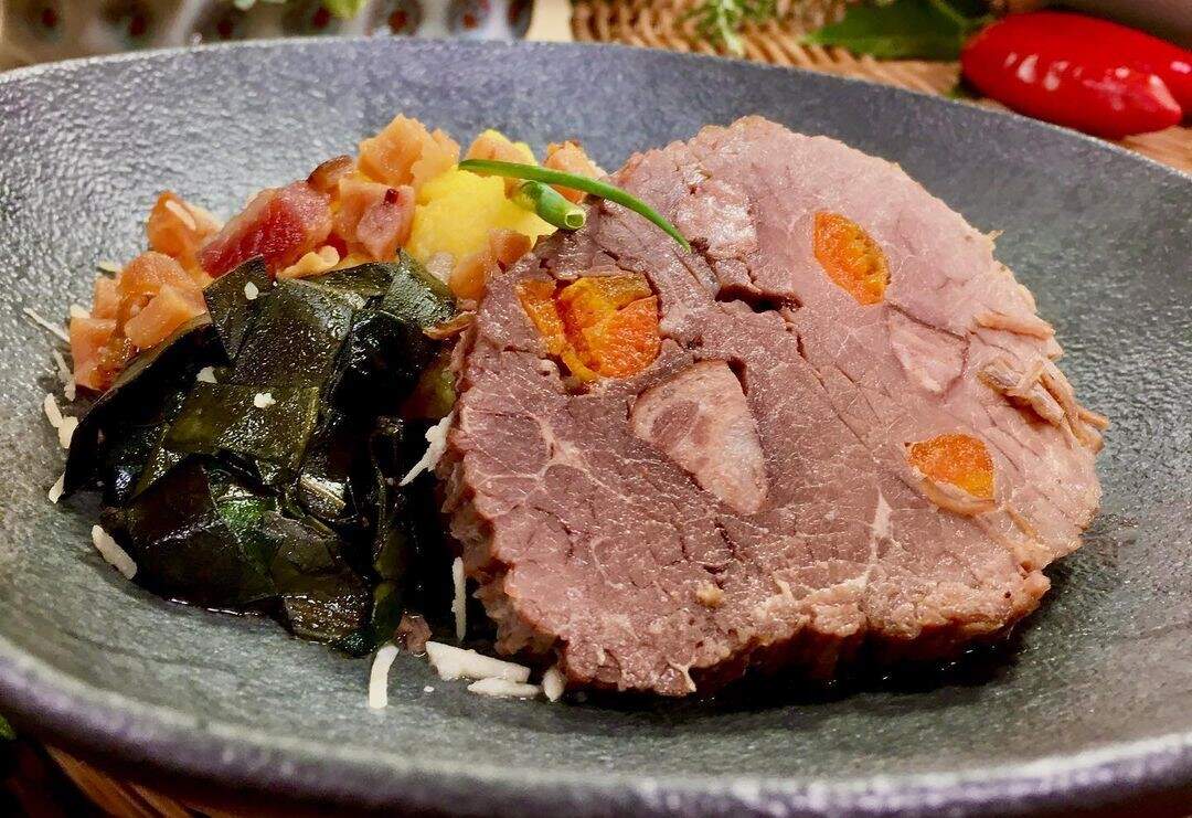 Corte o lagarto em fatias grossas (1 a 2 dedos de espessura). Este processo fica mais fácil com a peça morna ou fria. Disponha a polenta em um refratário, acomode as fatias em um dos lados e a verdura refogada do outro. Sirva em seguida.