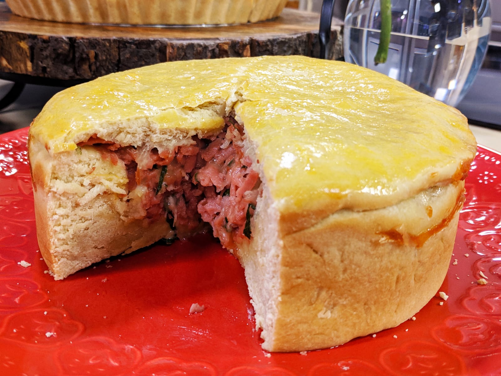 Numa bacia, coloque o leite, o açúcar, o óleo, o azeite, o sal, o fermento, o ovo e misture com auxílio de uma colher. Coloque a farinha aos poucos e misture até soltar das mãos. Leve a massa para uma bancada untada com óleo e sove durante uns 10 min. tampe com plástico e deixe descansar aproximadamente 30 min. Divida a massa em duas partes. Em uma forma com fundo removível untada com óleo, forre o fundo e as laterais (aproximadamente na altura do recheio), coloque o recheio, cubra com a massa, pincele com a gema e decore. Coloque para descansar por aproximadamente 30 min, até dobrar de volume. Leve para assar no forno pré-aquecido por aproximadamente 25 min, até dourar.