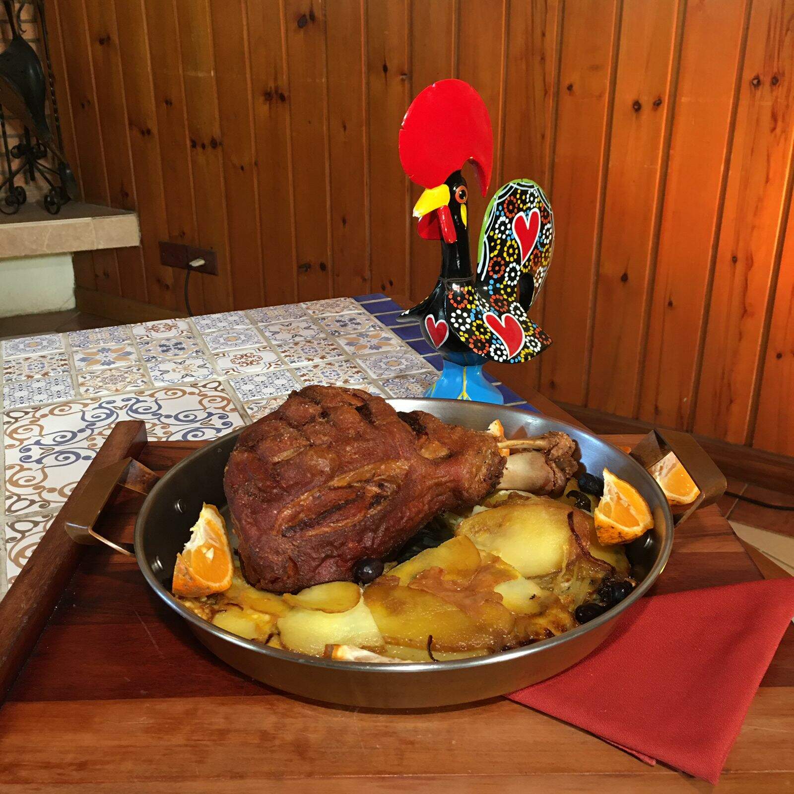 Depois de assado retira-se do espeto, dispõe-se numa travessa e serve-se bem quente com salada de laranja e alface. Acompanha-se com batatas fritas.