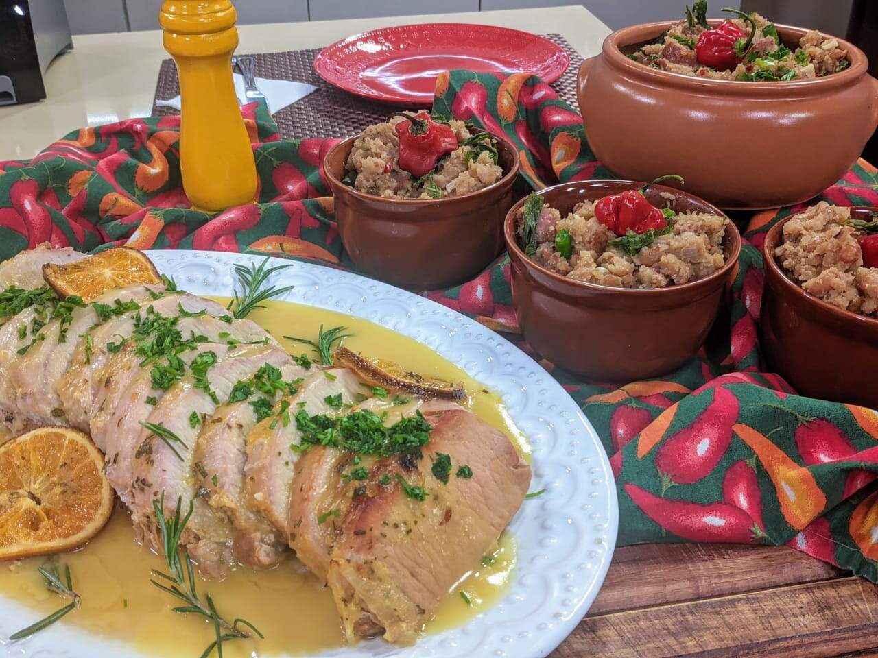 Modo de preparo: em um liquidificador, colocar o suco de laranja, o vinho, o suco de limão, o alho, a folha de louro, o alecrim, o gengibre e o mel e bater por 1 minuto. 2- despejar sobre o lombo temperado com sal e pimenta do reino em uma travessa, e deixar por 4 horas na geladeira. Tirar da geladeira, colocar o lombo em um papel alumínio, com a marinada, a laranja e as raspas e regar azeite, fechar e assar por 1h e 20 min em forno 180°c. Tirar o alumínio e deixar dourando por mais 15 minutos.