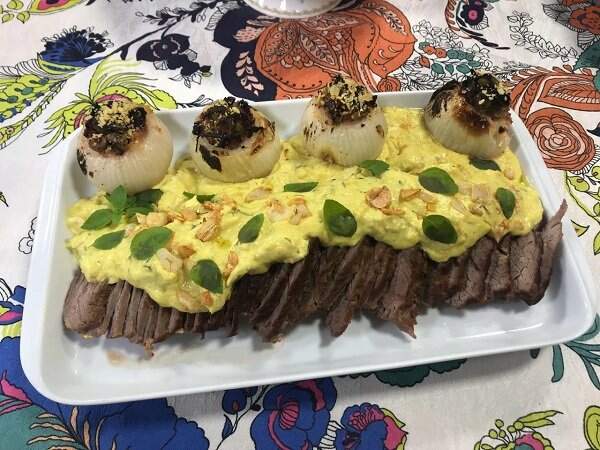 3. Vamos voltar para a carne; em um a frigideira ou panela distribua os elementos do defumador, coloque uma grade de metal nas bordas da sua panela, disponha a carne, cubra com papel alumínio e mantenha por mais 15 minutos afim de que a fumacinha que irá surgir possa atribuir aroma e sabor à sua maminha. Então, após este tempo, passe para uma tábua, fatie e sirva com a mostarda.