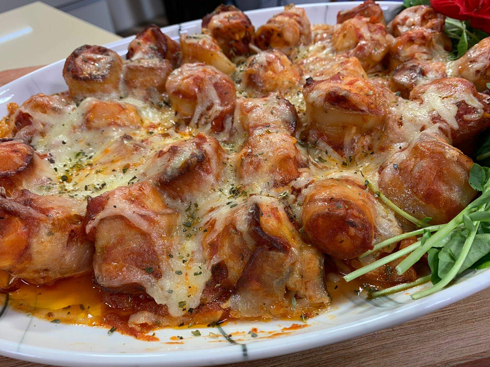 Corte o peito de frango em cubos grandes. Acrescente o frango e os temperos e deixe descansar por 1 hora na geladeira. Compre uma peça de bacon com cerca de 15 a 20 cm de comprimento e corte o bacon em fatias finas, ou já compre o bacon fatiado. Em cada cubo de frango, enrole uma fatia de bacon. Depois, prenda com um palito de dente. Coloque os medalhões de frango com bacon numa assadeira e leve-os ao forno pré-aquecido em temperatura alta (280ºC) até dourar bem. O tempo pode variar entre 25 a 30 minutos. Retire os palitos de dente do frango e acrescente 200 ml de molho de tomate e 200 gramas de muçarela. E coloque no forno até dourar o queijo por aproximadamente 10 minutos.