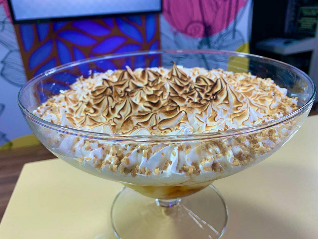Coloque o creme na base do recipiente. Em seguida, coloque as bananas carameladas, mas sem a calda. Por fim, finalize com o merengue suíço, podendo ou não maçaricar para “queimá-lo”. Leve para a geladeira e sirva gelado.
