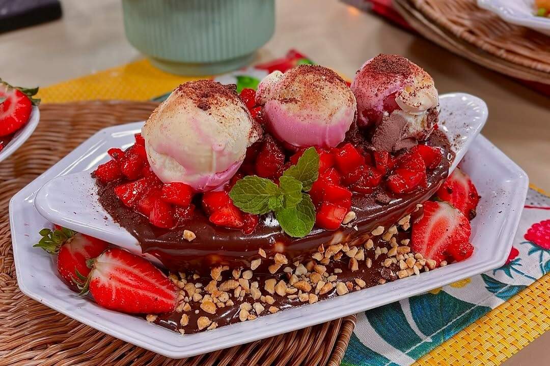 Espetar a paleta mexicana no brownie, cobrir com morangos e enfeitar com o hortelã.