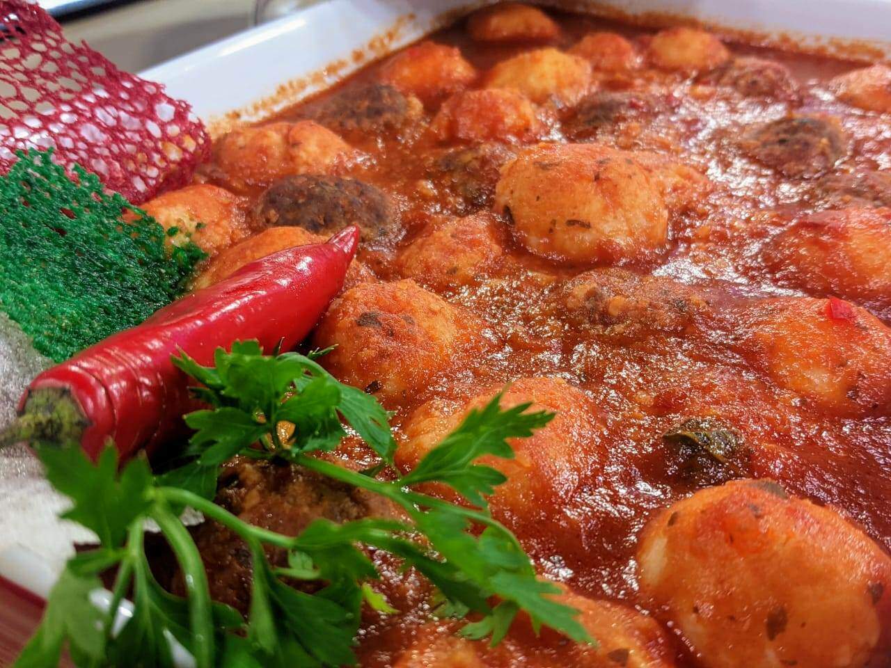 Modo de preparo: numa panela, coloque o azeite e o alho e doure um pouquinho. Coloque a pimenta dedo-de-moça picadinha e o molho de tomate. Acrescente a água aos poucos. Mexa e acerte o sal e coloque a pimenta calabresa. Acrescente as almôndegas fritas. Se precisar, coloque mais um pouco de água e deixe o molho encorpar. Acrescente o nhoque e deixe ferver por uns 3 minutos para cozinhar. Cuidado ao misturar para não desmanchar as bolinhas. Acrescente folhas de manjericão. Desligue o fogo e está pronto! Sirva com queijo ralado.