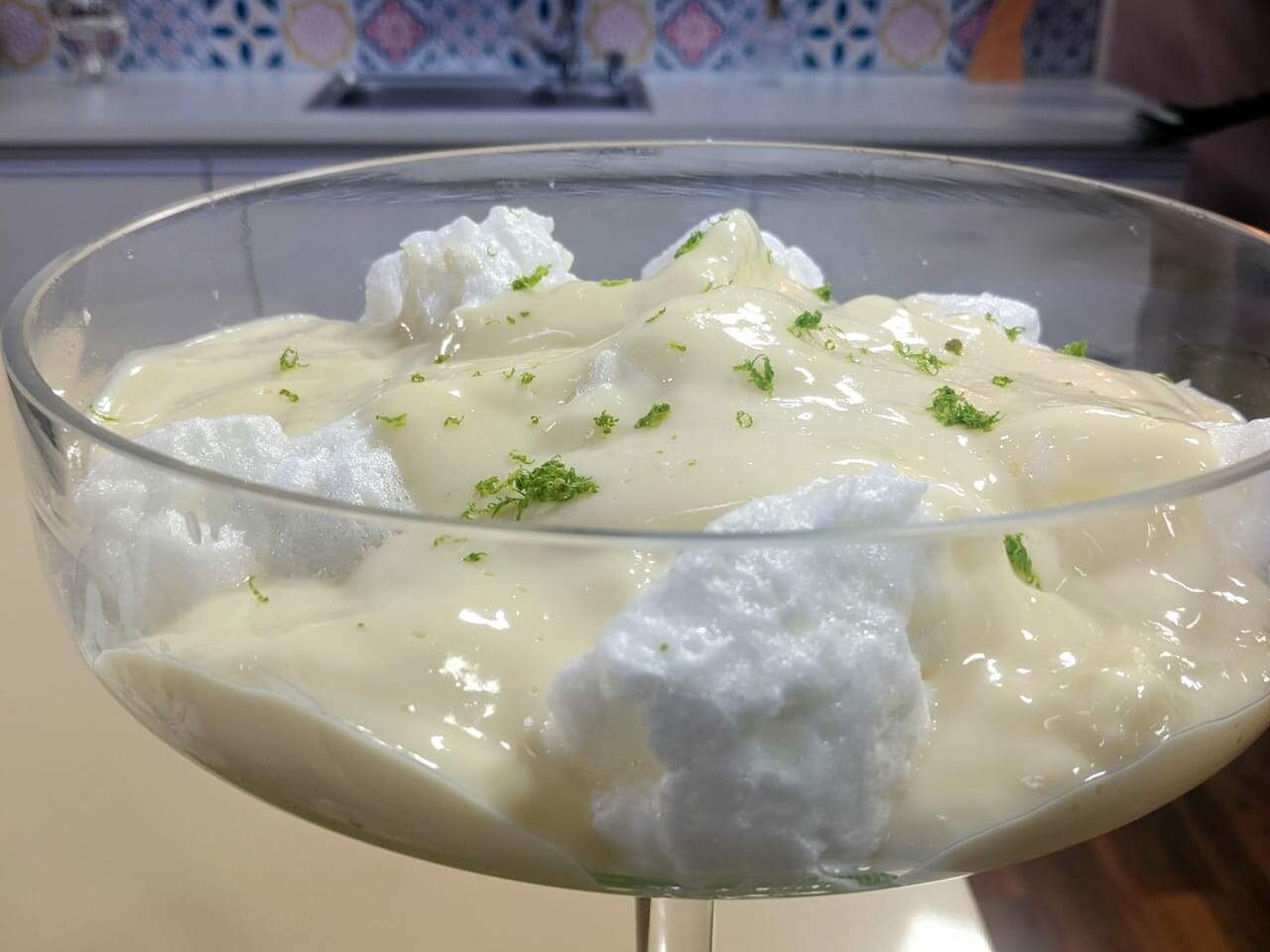 Coloque o leite, o açúcar, a casca de limão e a baunilha em uma panela. Deixe ferver em fogo baixo. Bata as claras em neve, coloque colheradas no leite quente e retire com uma escumadeira, colocando em uma compoteira. Misture o amido com um pouco de leite frio, bata as gemas com a manteiga e acrescente tudo no leite fervendo, formando um creme. Coloque por cima das claras cozidas e sirva gelado.