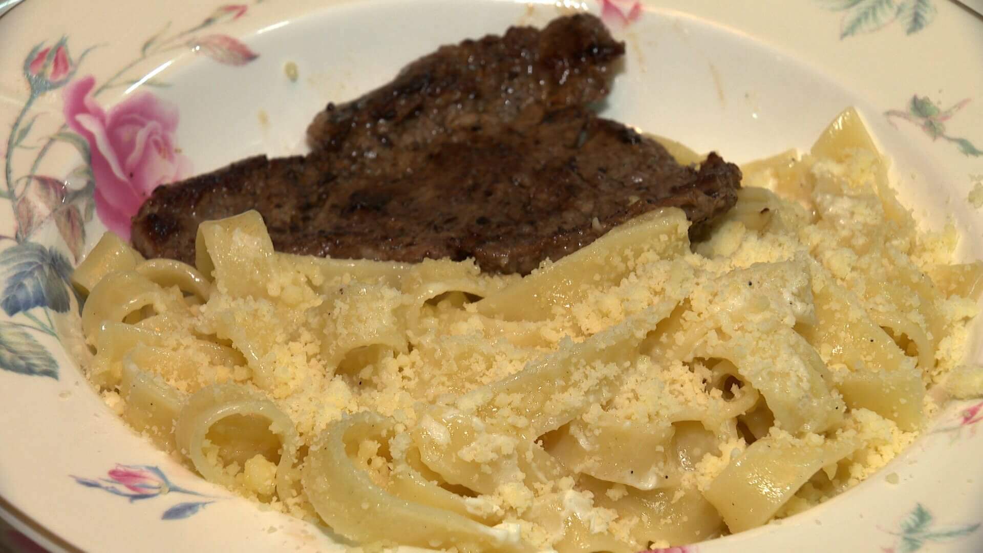 4. Acrescente o parmesão ralado e misture para que ele incorpore á massa. Durante a fase final da preparação da massa, esquente a colher de manteiga que sobrou e grelhe os filés uns três minutos de cada lado e sirva com o fetuccine.