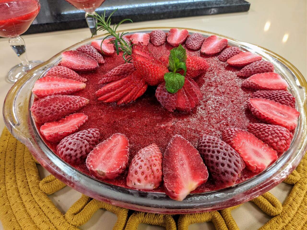 Coloque o creme de leite condensado sobre a pasta de morango que ficou no freezer. Leve novamente ao freezer por mais 2 horas. Passado o tempo, retire do freezer, coloque a outra metade da pasta de morangos e leve novamente ao freezer por mais 4 horas.