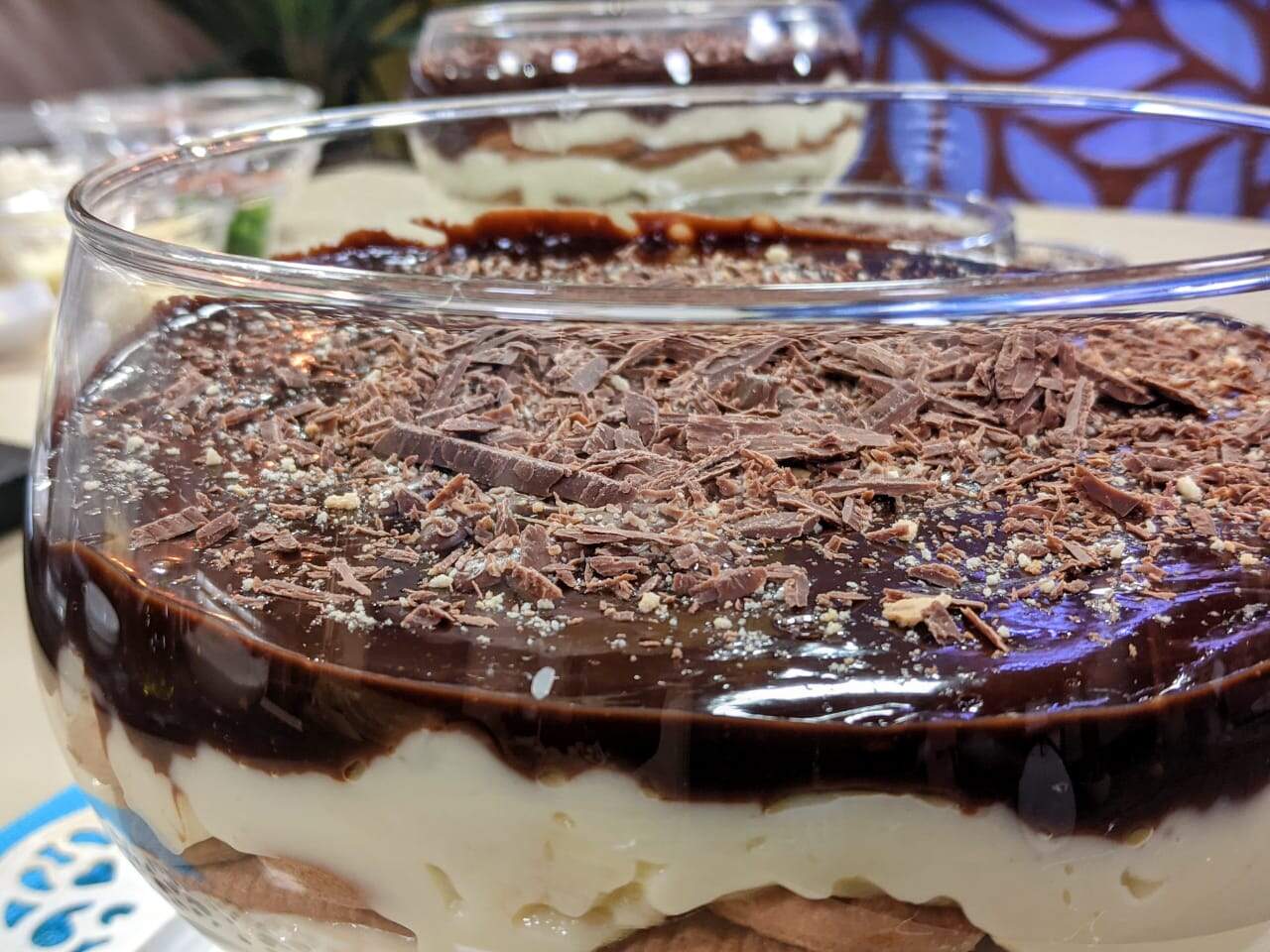 Misture o leite e o chocolate para molhar as bolachas. Alterne camadas na seguinte ordem: creme de baunilha, bolacha, ganache, creme de baunilha, bolacha, ganache, creme de baunilha, bolacha, creme de baunilha e ganache. Com a faca, quebre o chocolate branco grosseiramente e coloque por cima. Leve à geladeira e sirva no dia seguinte. Para servir, separe com uma faca e retire com espátula de bolo. Fica bonito no prato. Rende uma travessa de vidro retangular de tamanho aproximado 30x18x5 cm.