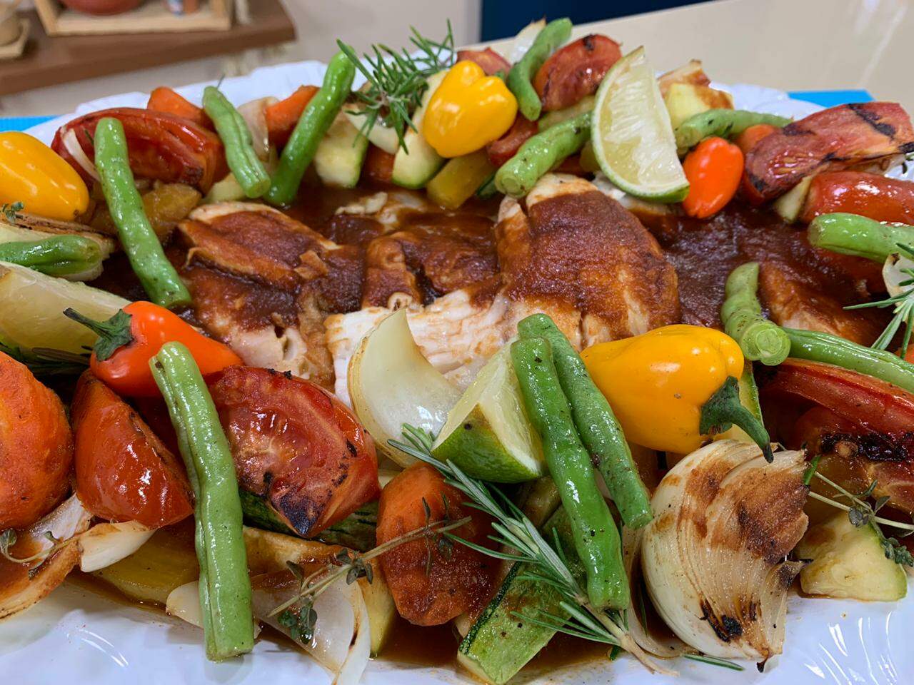 Ponha em contato direto no fogo do fogão. Pimentão, beterraba, cenoura e mandioquinha. Deixe carbonizar e retire do fogo. Com o auxílio de uma faca ou colher retire a casca e corte como se deseja. Corte também os demais ingredientes. Em uma frigideira aqueça o azeite, refogue o alho e entre com os legumes, assim que estiverem todos macios entre com os demais ingredientes para temperá-los. (DICA: para deixar todos os legumes com a mesma textura corte aqueles que são mais duros menores e os mais macios maiores ou mais Grosso. Assim todos vão cozinhar no mesmo tempo. E se caso precisar vá adicionar pouco de água neles até ficarem macios)
