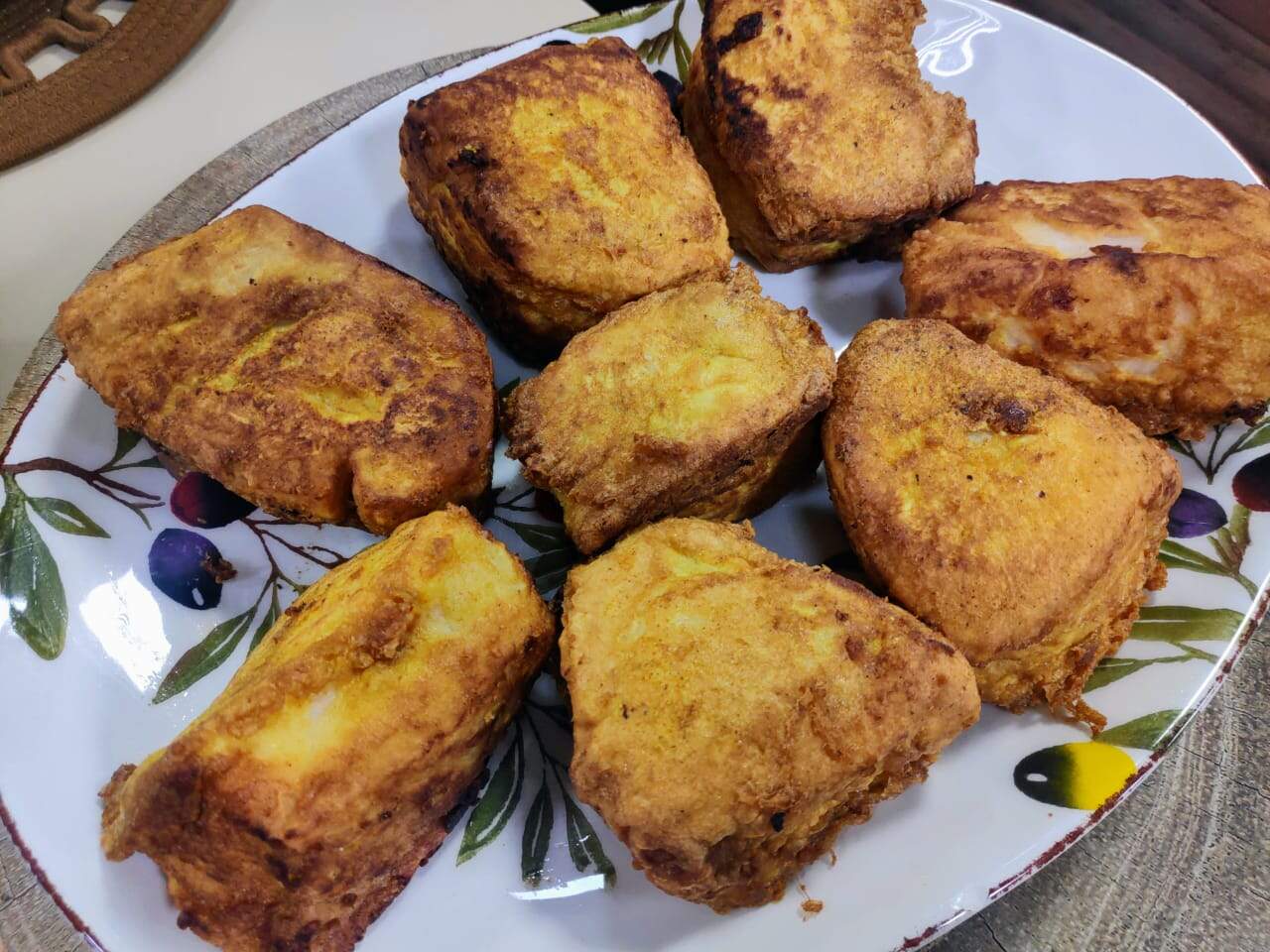 Corte o lombo em 4 postas. Tempere com o sal, o cominho e a cúrcuma e reserve. Bata o ovo em um prato e reserve. Passe as postas na farinha de trigo e depois no ovo e frite-os no óleo ou azeite. Sirva com molho de laranja e purê de batata doce.