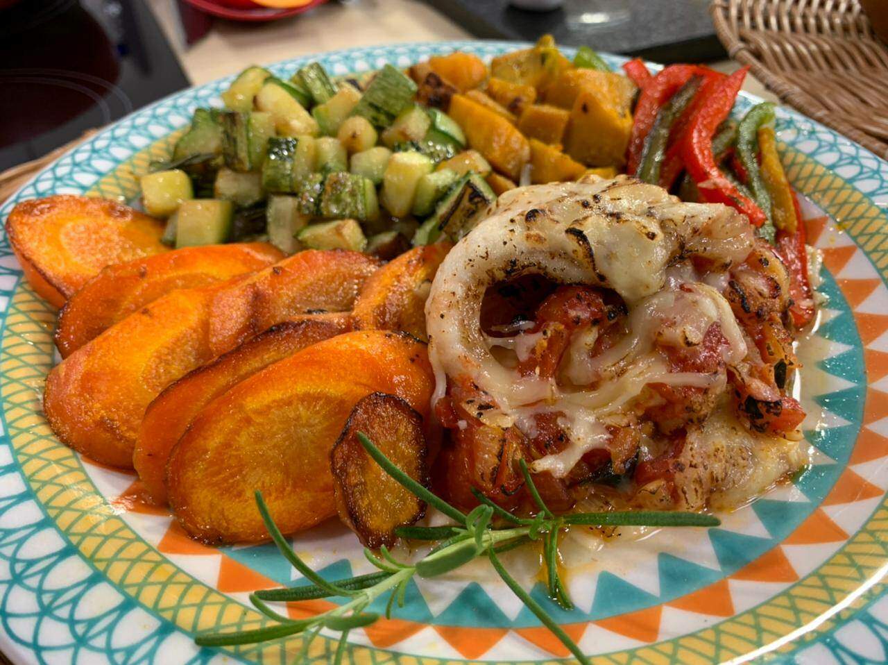 Tempere todos os legumes. Comece grelhando a cenoura até começar a dourar, coloque a abóbora, os pimentões e quando todos estiverem dourados, coloque a abobrinha. Tempere com sal e pimenta e um ramo de alecrim.