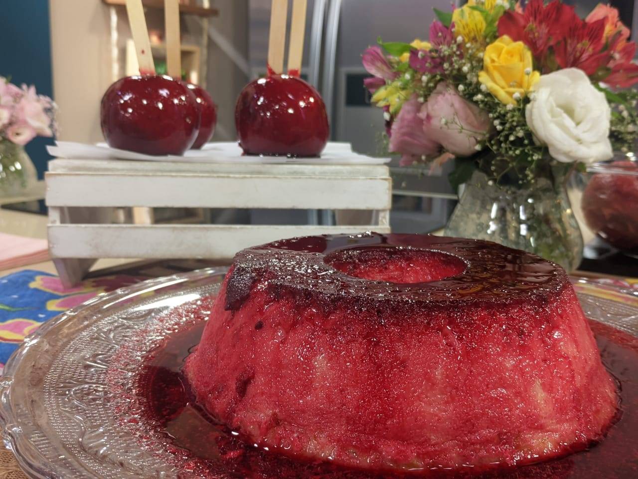 No liquidificador, coloque o leite condensado, o ovo e a maçã, bata e em seguida despeje na forma caramelizada, cubra a forma com papel alumínio. Na panela de pressão, coloque 2 xícaras de chá de água e coloque a forma dentro da panela de pressão. Tampe a panela e após pegar pressão, conte 10 minutos.