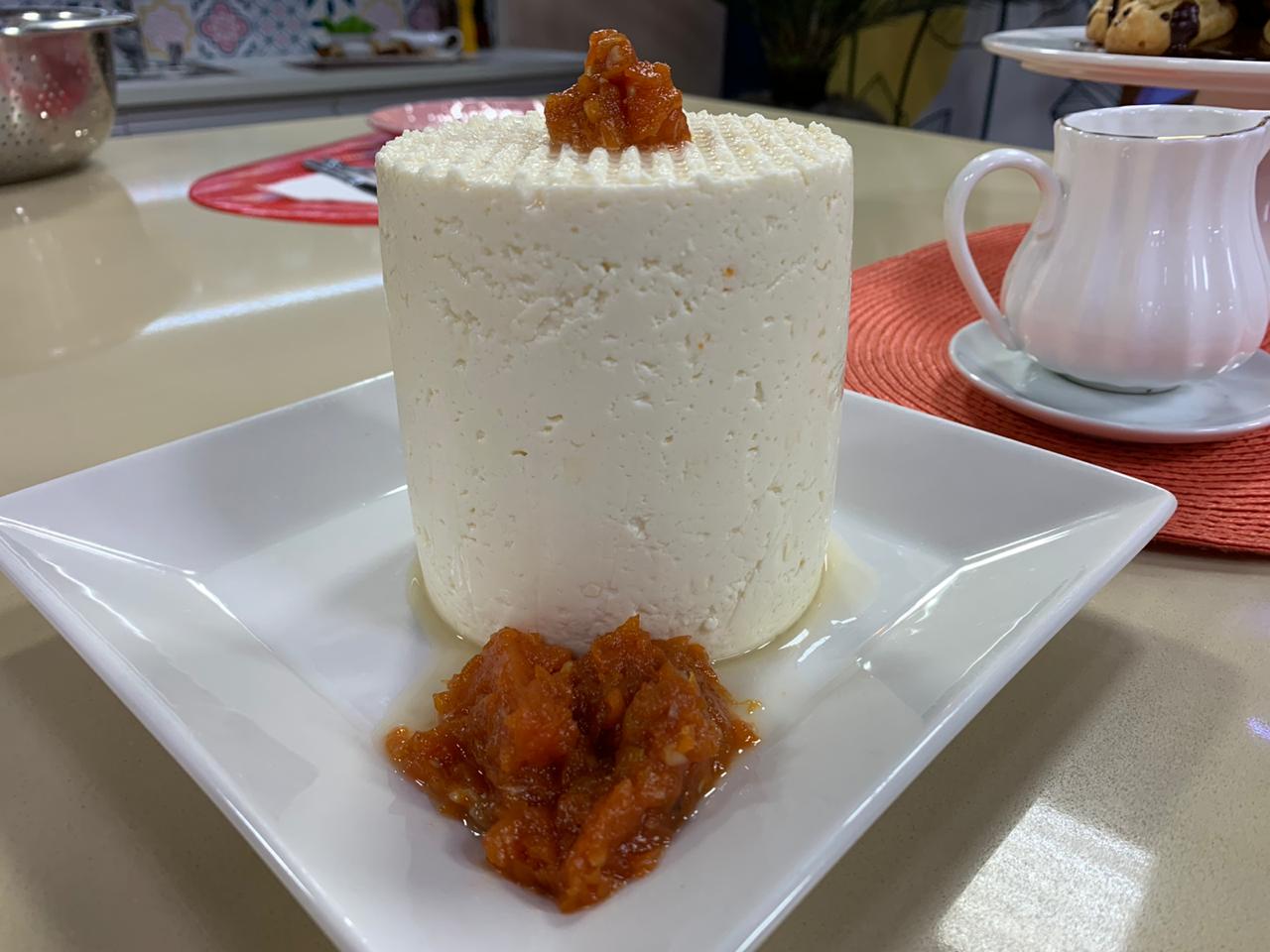 Modo de preparo: adicionar aos 5 litros de leite uma tampinha de coalho e 3 colheres de sal, deixar descansar por 30 minutos. A massa estará pronta. Próximo passo separar a massa do soro. Colocar a massa separada do soro nas forminhas e deixar por cerca de 4 horas. Com uma colher de sopa fazer um orifício no centro da massa e colocar o recheio de goiabada cremosa fechando o queijo. Deixar descansar por mais 3/4 horas e estará pronto! Além de ensinar a fazer esse queijo, vamos ter na bancada queijos trufados de creme de avelã, doce de leite, doce de mamão ralado, goiabada, requeijão.