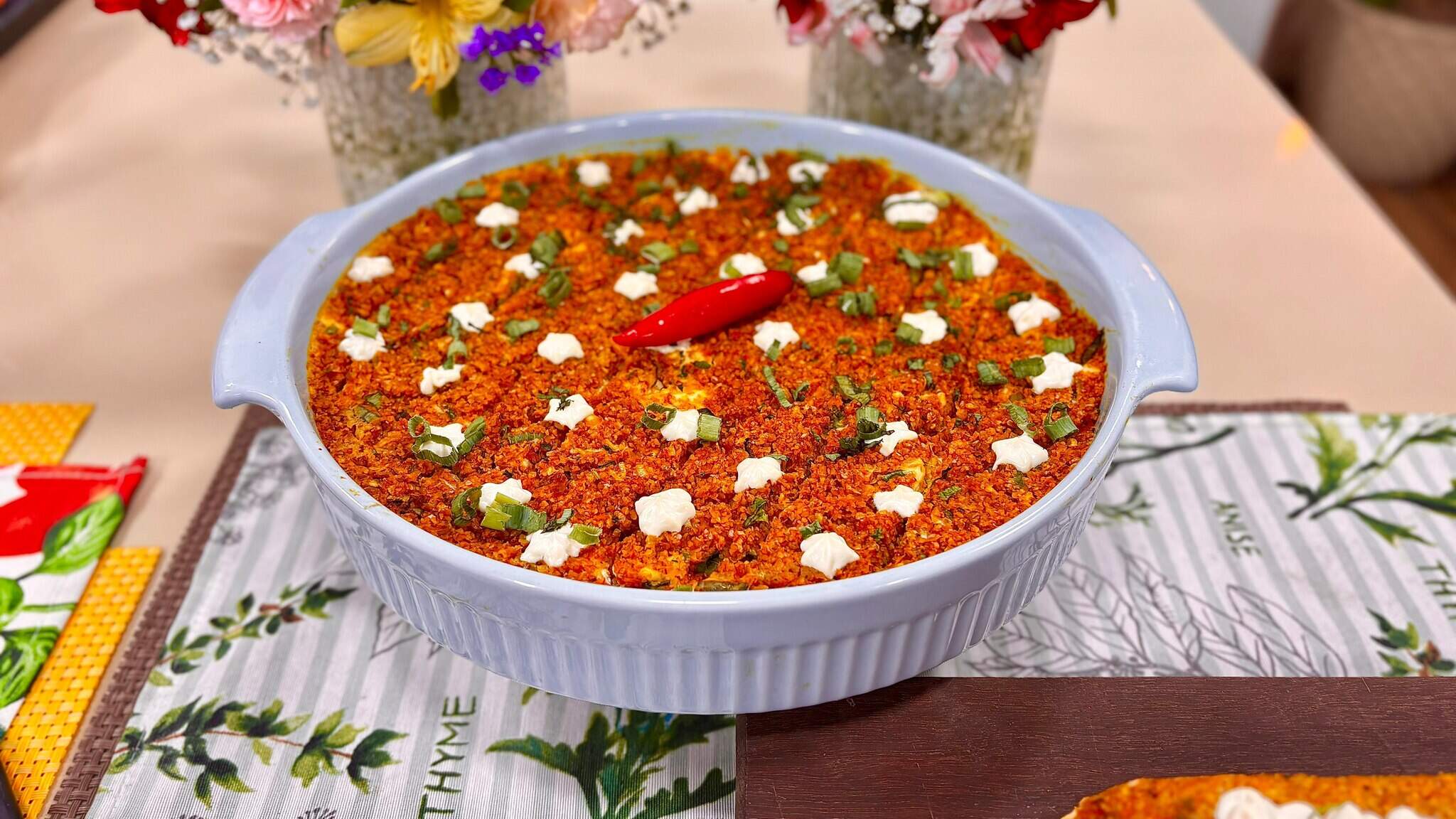 6. Unte um refratário com óleo ou azeite, coloque a primeira camada de massa e acrescente o cream cheese e leve para assar em forno médio (180° C), até que o quibe esteja com uma casquinha crocante sobre ele (aproximadamente 30 minutos).