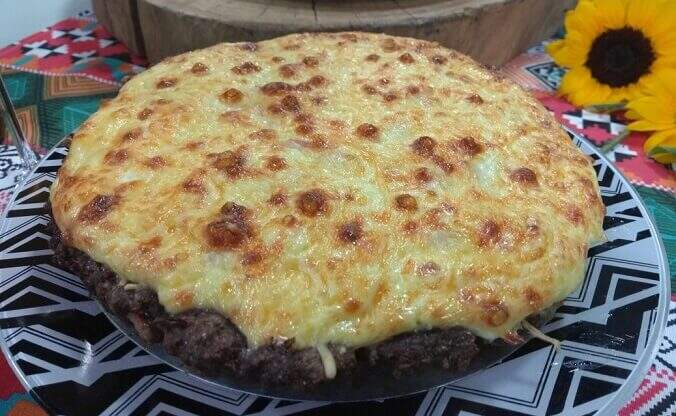 Modo de preparo do recheio: numa tigela misture 500 g de carne moída magra, ½ cebola ralada, 3 colheres (sopa) de farinha de trigo integral, 1 clara e 1 colher (chá) de sal. Forre o fundo e a lateral de uma forma de fundo falso untada com azeite (27 cm de diâmetro) com esta mistura de carne e leve para assar em forno a 250° c por +/- 10 minutos. Obs: não deixe assar demais para não ressecar a carne.