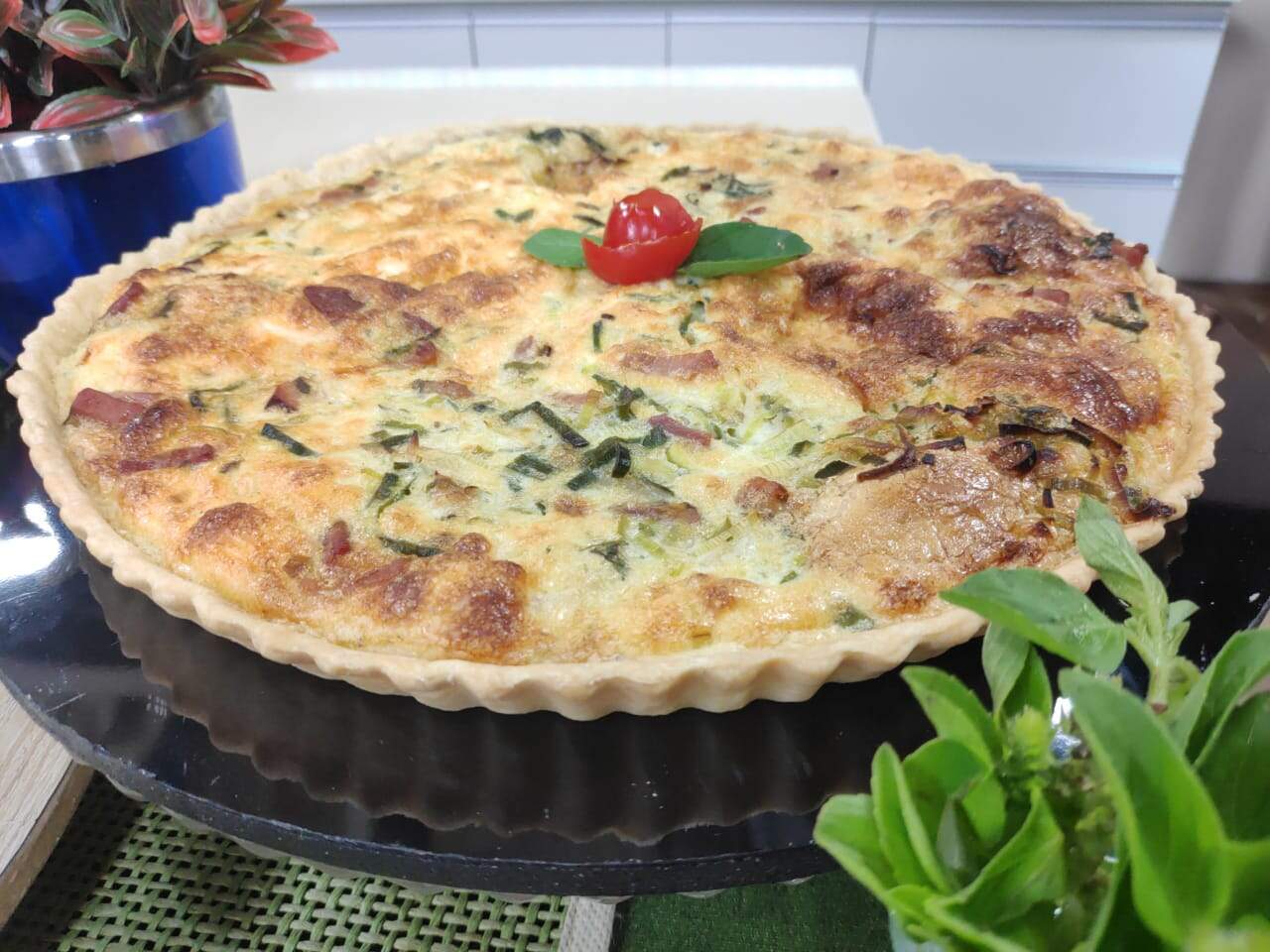 Com cuidado, retire o papel manteiga com os grãos de feijão. Para rechear a quiche, coloque os ingredientes na seguinte ordem: distribua no fundo da massa o queijo ralado, os cubos de bacon com alho-poró e preencha com o creme de ovos. Volte a forma ao forno para assar por cerca de 20 minutos ou até a quiche inflar e ficar bem dourada. Sirva a seguir com salada de folhas.