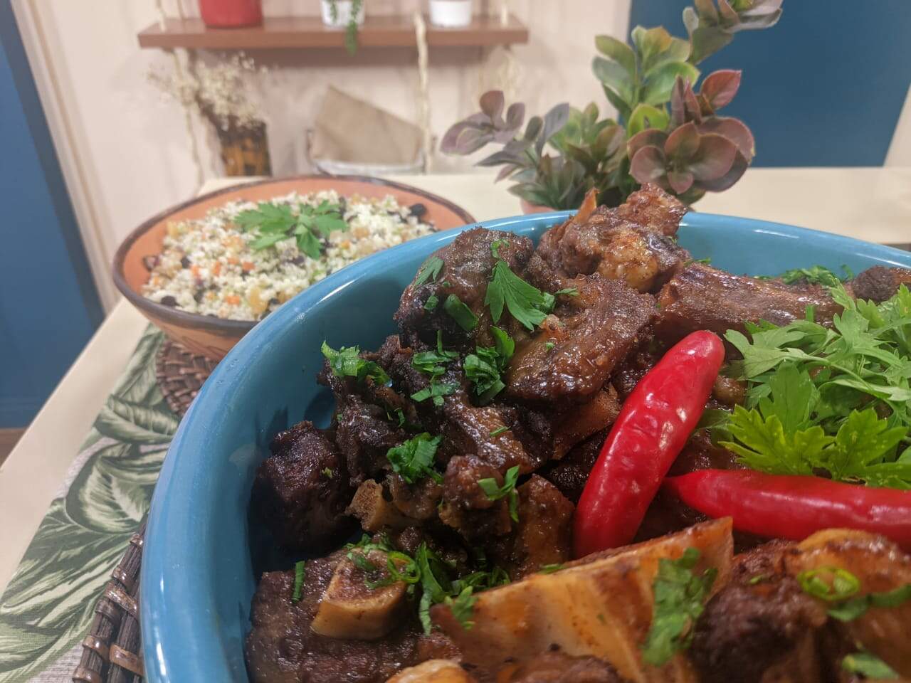 Retire o excesso de gordura do rabo bovino e coloque em uma panela para selar. Depois, acrescente dois dedo de alho, ½ cebola e as folhas de louro. Adicione 500 ml de água e deixe na pressão por 20 minutos. Retire o caldo e deixe a carne na panela, adicione alho, uma cebola picada, a páprica, as folhas de louro, cheiro verde e cubra com água por mais 30 minutos na pressão.