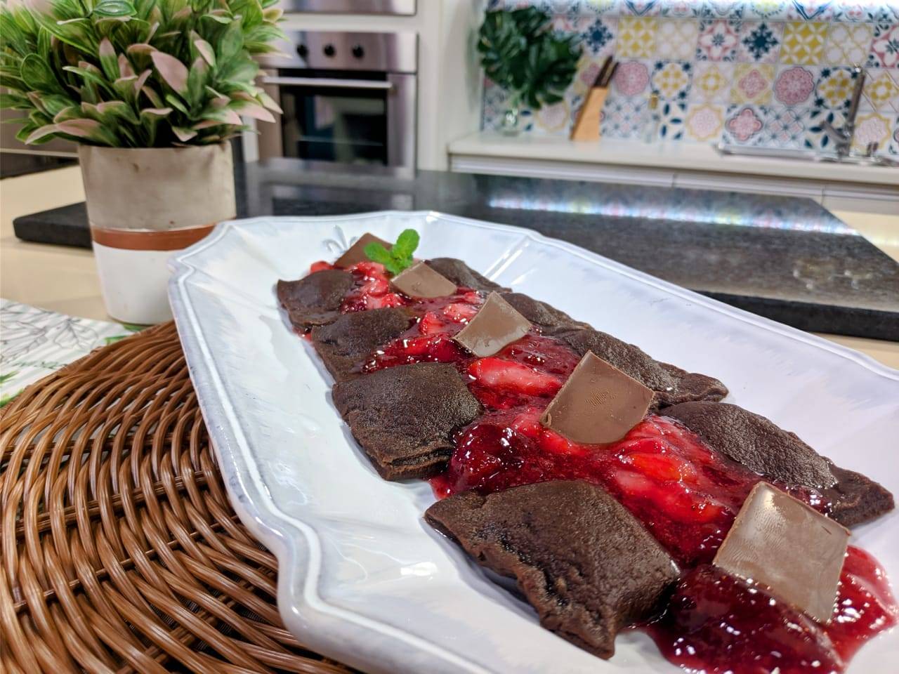 Misturar os ingredientes secos da massa, abrir uma covinha, colocar o óleo de coco e o ovo e misturar até ficar homogêneo (não sovar a massa). Dividir a massa em 2 bolinhas, abrir com o rolo de macarrão ou uma garrafa de vidro. Colocar os cubinhos de chocolate espaçados, cobrir com a outra metade da massa já aberta, apertar suavemente e cortar os raviolis. Reserve cobertos com um pano. Misturar os morangos com açúcar e água numa panela, mexer até formar uma calda. Cozinhe os raviolis até boiarem e servir quente ou frio com a calda por cima.