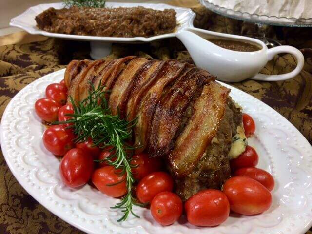 Modo de preparo: misturar a manteiga com o alho, a pimenta do reino e sal, passar em toda a carne por dentro e fora, rechear a cavidade com os queijos, fechar com palitos, envolver a carne com as fatias de bacon, levar ao forno por 1 hora, servir em seguida.