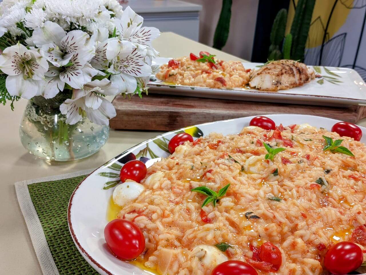 picado e mexemos mais um pouco. Assim que o grão estiver “al dente” abaixe o fogo, acrescente o tomate cereja e o manjericão, mexa mais um pouco e desligue o fogo. Nesse momento, vamos fazer um processo que se chama mantecatura, que é quando adicionamos a manteiga gelada e o parmesão no risoto com o fogo desligado e movimentamos constantemente até que chegue ao ponto cremoso que tanto esperamos. E para finalizar, adicionamos o manjericão e a muçarela de búfala inteira incorporando-os lentamente ao risoto. Sirva de preferência em um prato fundo e decore com folhinhas de manjericão, tomate cereja e um fio de azeite.