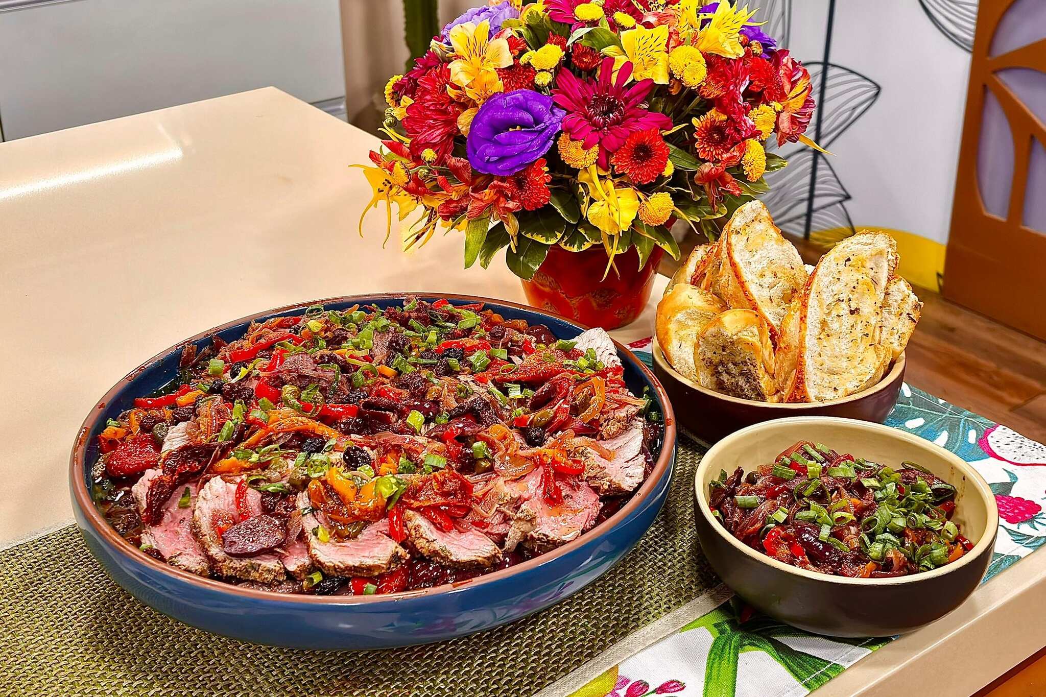 - Retire o filé da geladeira, pincele a mostarda e faça fatias bem finas. Coloque o refogado em cima e finalize com tomate seco, uvas-passas, cebolinha verde e regue bastante no azeite.