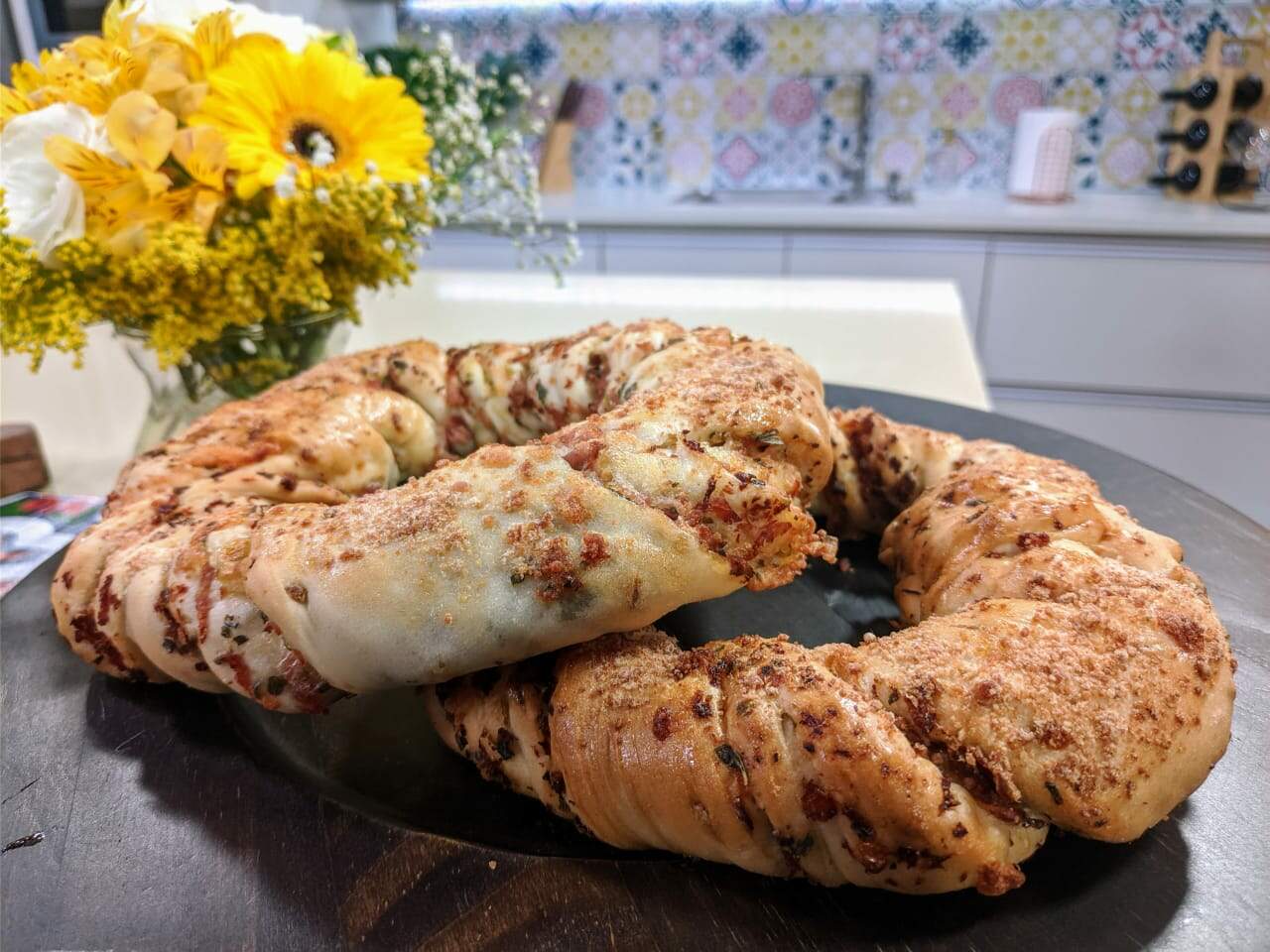 Separe o alho e misture tudo dando ponto com água, sovar a massa muito bem, colocar por último o alho na massa, deixar essa massa descansar 10 minutos, após descansar abrir a massa com um rolo e colocar o recheio, dobre a massa e abrir novamente com um rolo, modele ela em formato de rosca e deixar crescer até dobrar de tamanho, caso queira pincele ovos por cima para dar cor e decore com queijo ralado, leve ao forno pré-aquecido a 180 graus por 20 minutos.